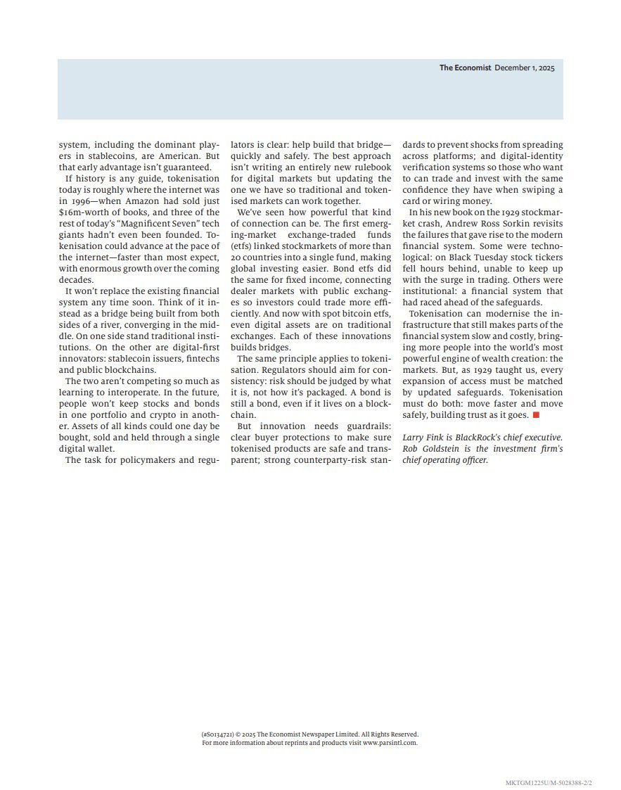 BlackRock CEO Larry Fink and President Rob Goldstein published a major essay in The Economist arguing that the next evolution of global finance will be driven by tokenization, the process of putting real-world assets like real estate, bonds, and funds on blockchain-based digital ledgers.